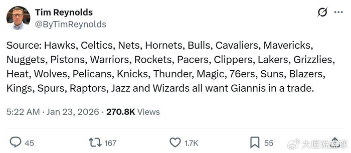 美联社知名记者Tim Reynolds就在报道中指出,如果字母哥进入交易市场,联盟中其余29支球队都对其有意,其中自然也包括火箭队。